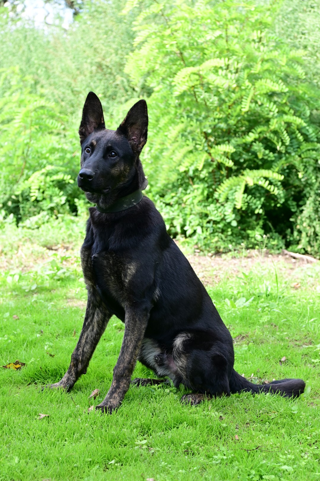 Zek is a large, dark male with striking brindled legs and an impressive, commanding appearance. His calm, people-oriented nature is paired with a naturally powerful pushing grip, making him a highly capable dog with excellent potential for professional work.
